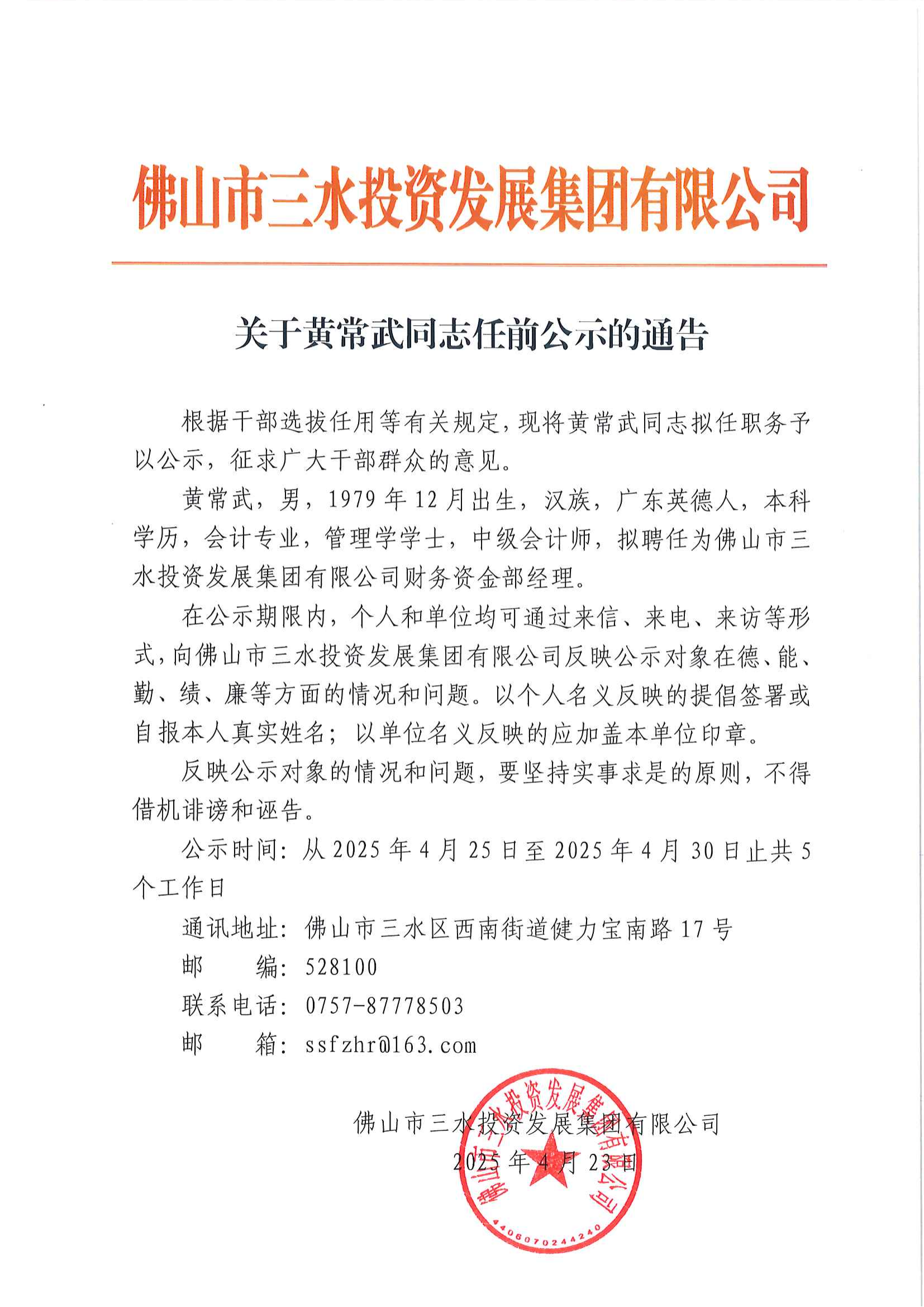 关于黄常武同志任前公示的通告
