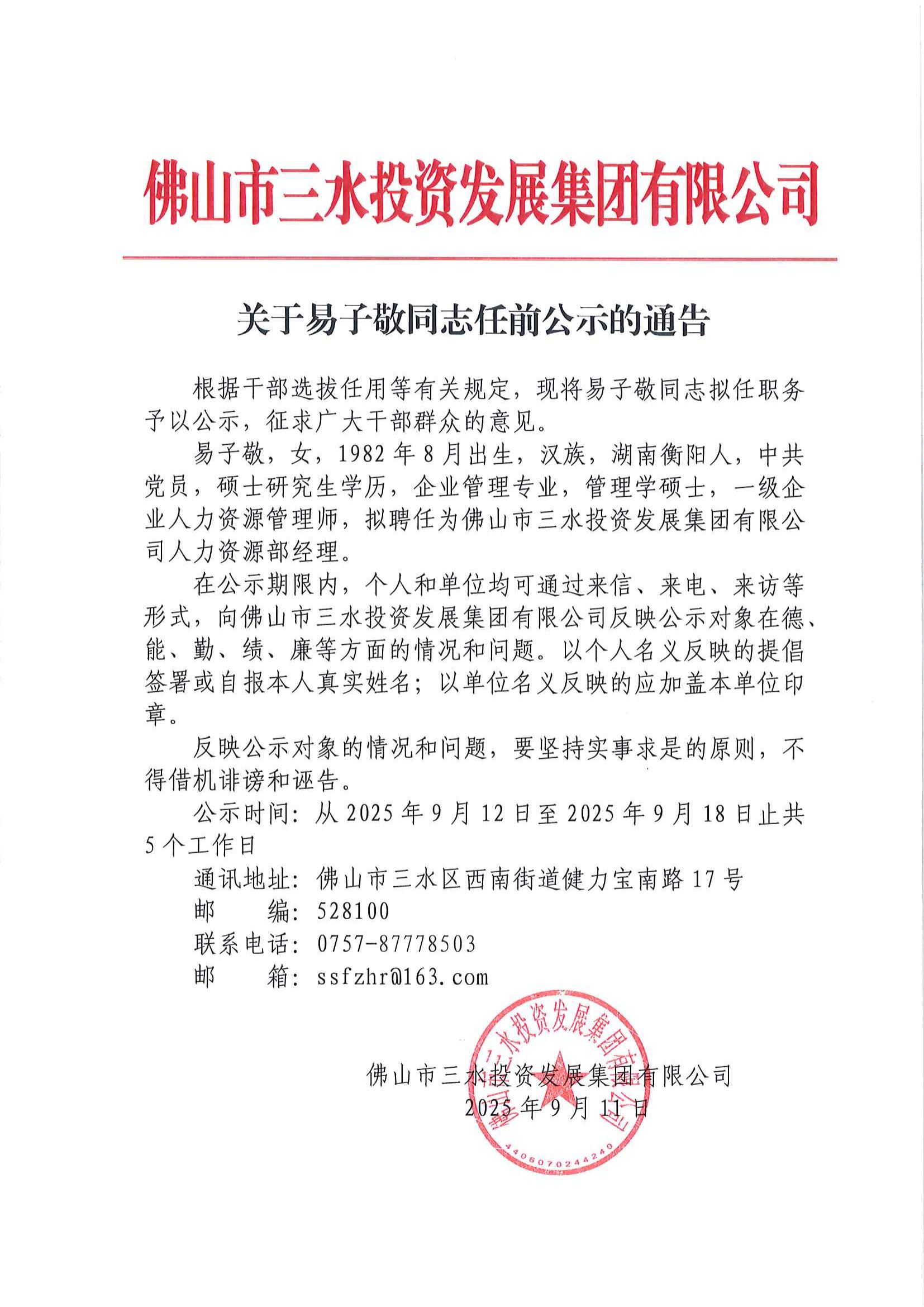 关于易子敬同志任前公示的通告