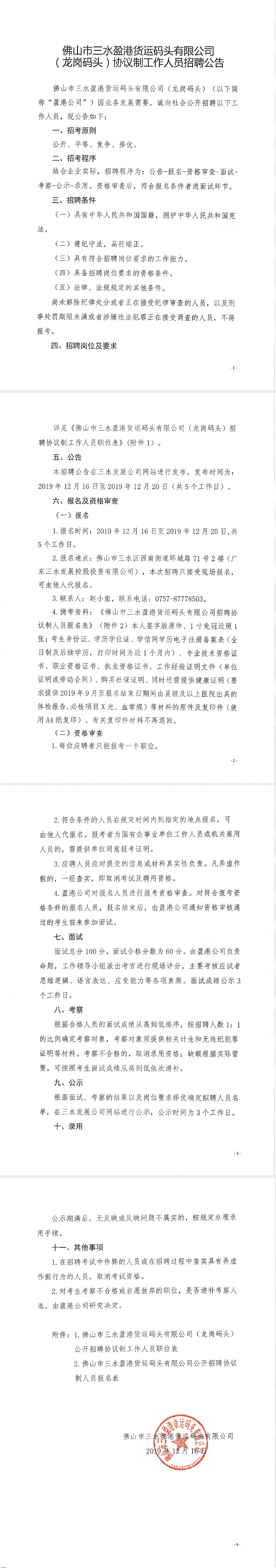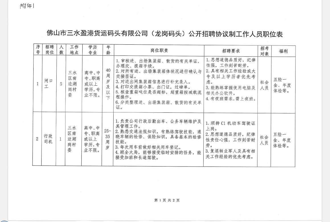 佛山市三水盈港货运码头有限公司公开招聘第二批协议制工作人员公告
