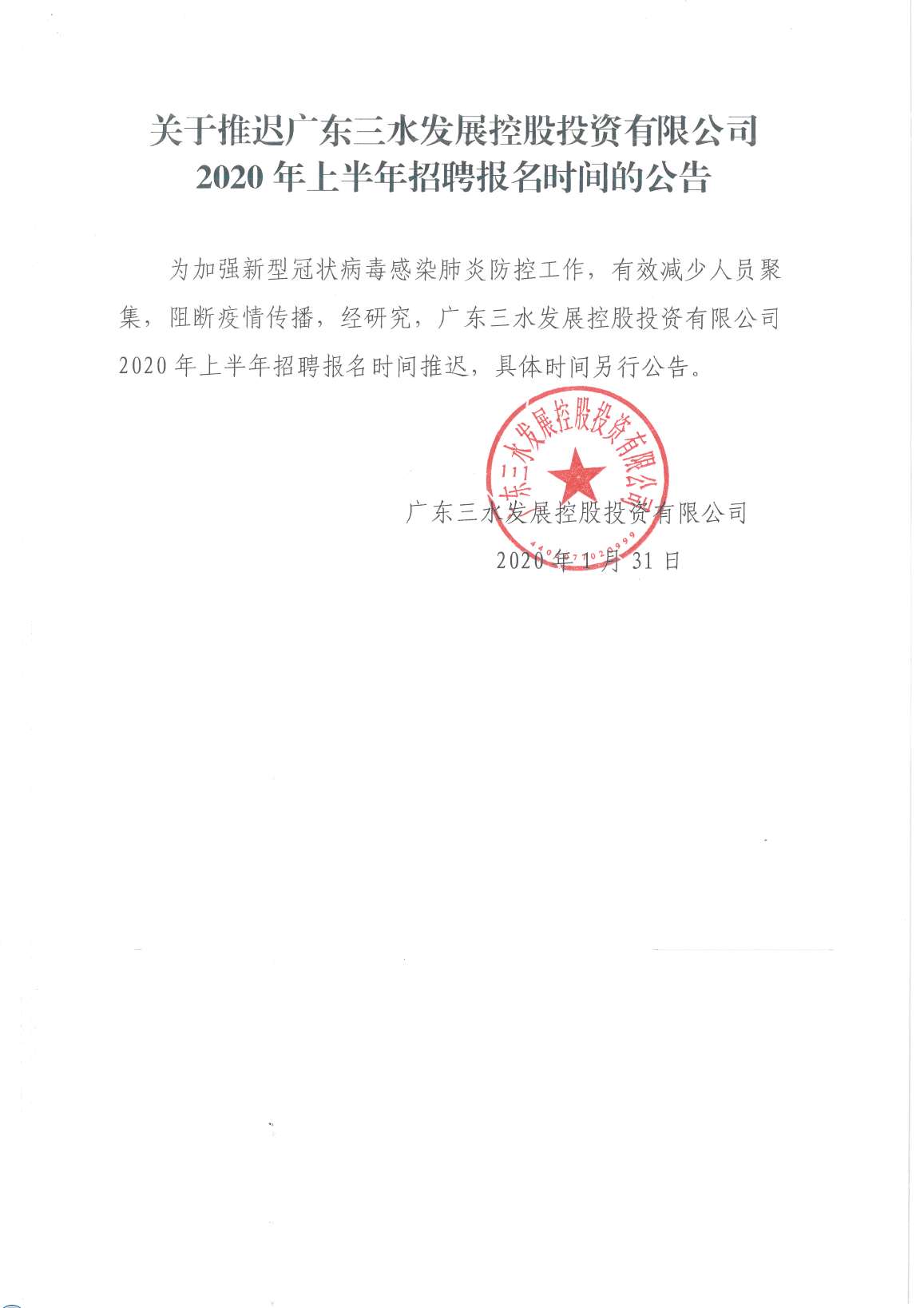 关于推迟广东PA视讯集团游戏控股投资有限公司2020年上半年招聘报名时间的公告