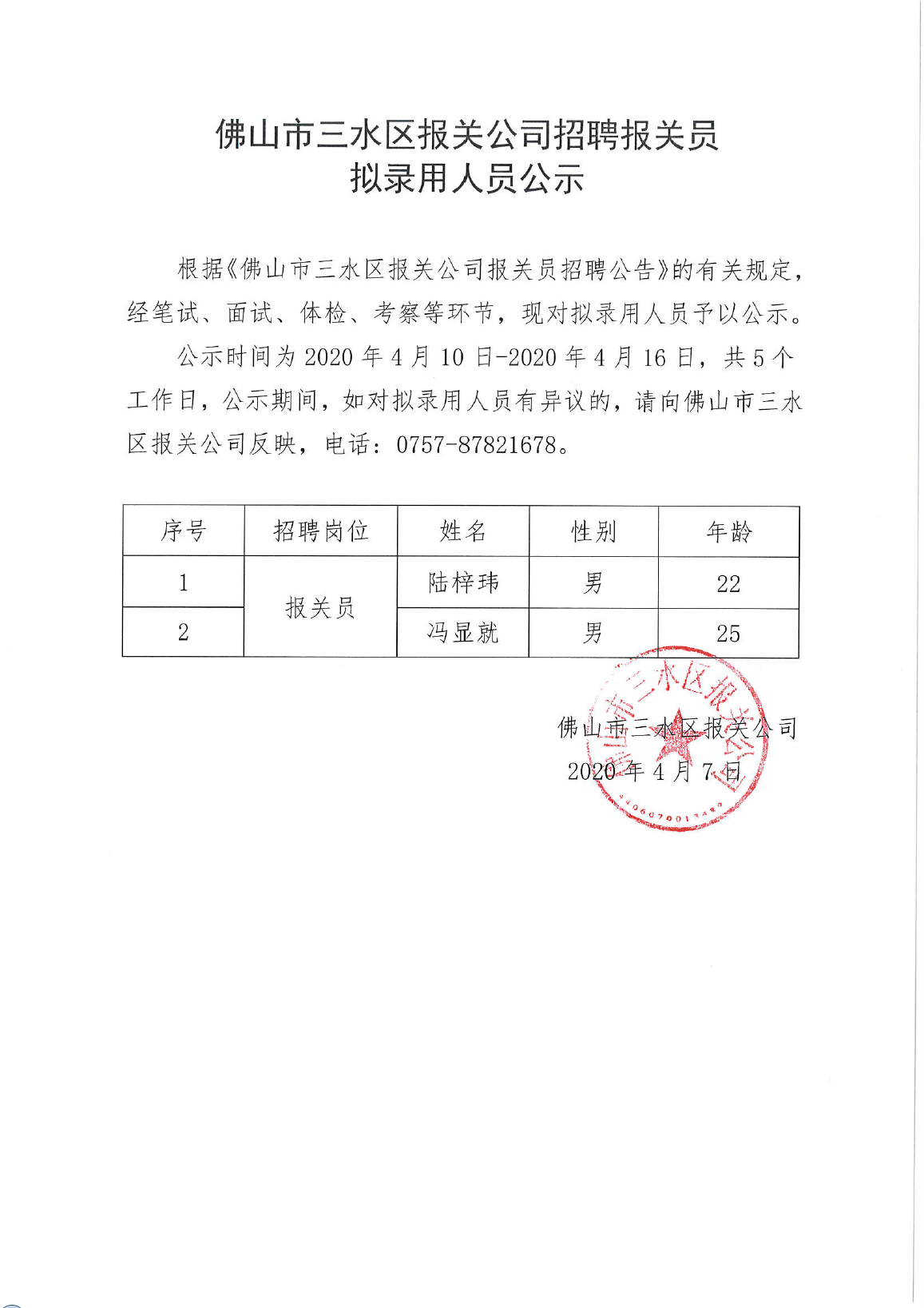 佛山市三水区报关公司招聘报关员拟录用人员公示