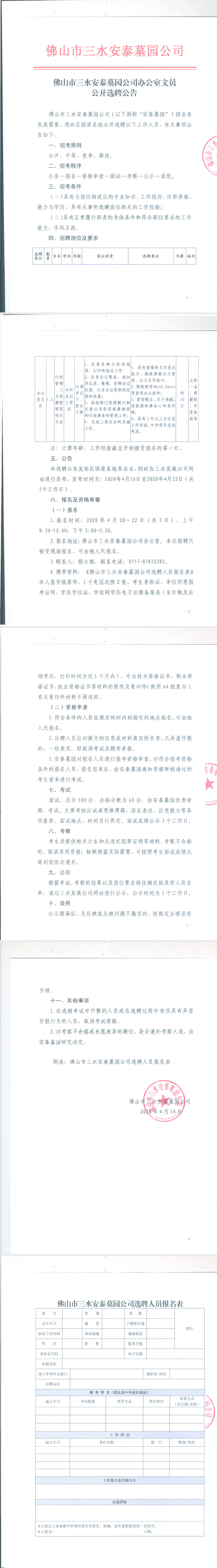 佛山市三水安泰墓园公司办公室文员公开选聘公告