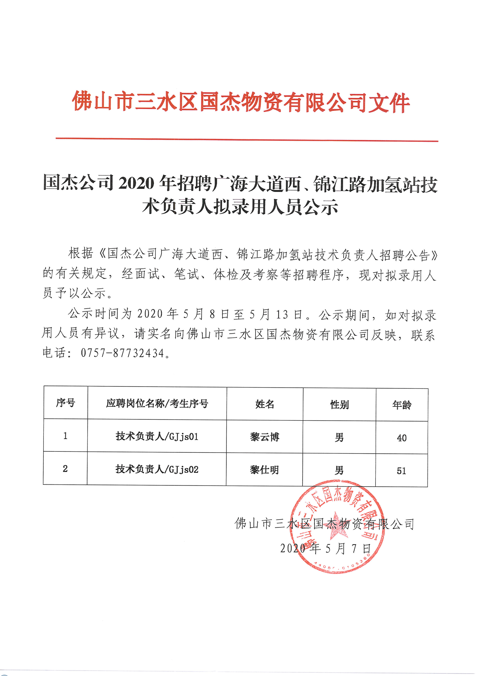 国杰公司2020年招聘广海大道西、锦江路加氢站技术负责人拟录用人员公示