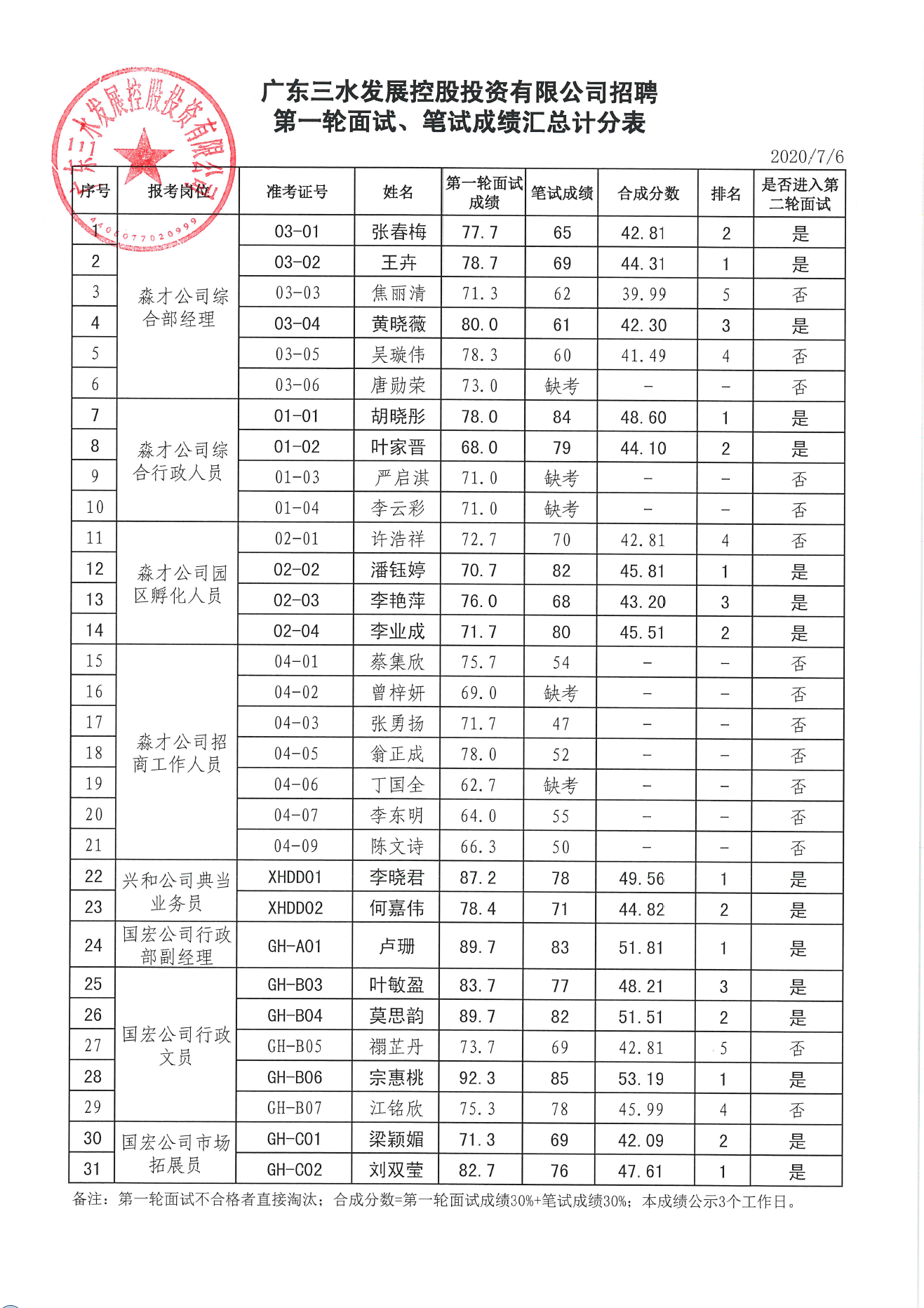 广东PA视讯集团游戏控股投资有限公司招聘第一轮面试、笔试成绩汇总计分表