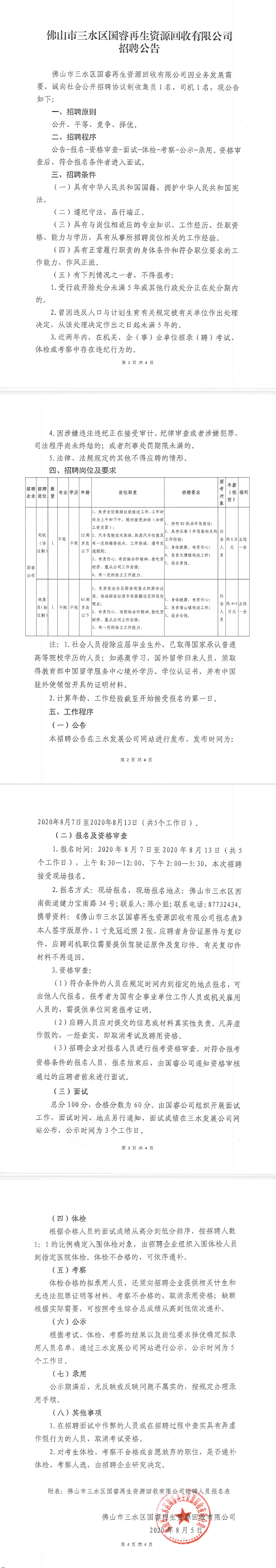 佛山市三水区国睿再生资源回收有限公司招聘公告